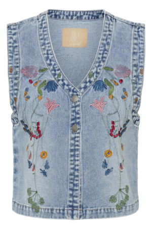 Smuk og feminin quiltet vest fra Culture. Vesten har en flot mørkeblå farve med fine hvide kontrast kanter samt et smukt farverigt broderi på ryggen. Den lette vattering gør den behagelig at have på og perfekt som et ekstra lag, ideel over skjorter, bluser og kjoler.
