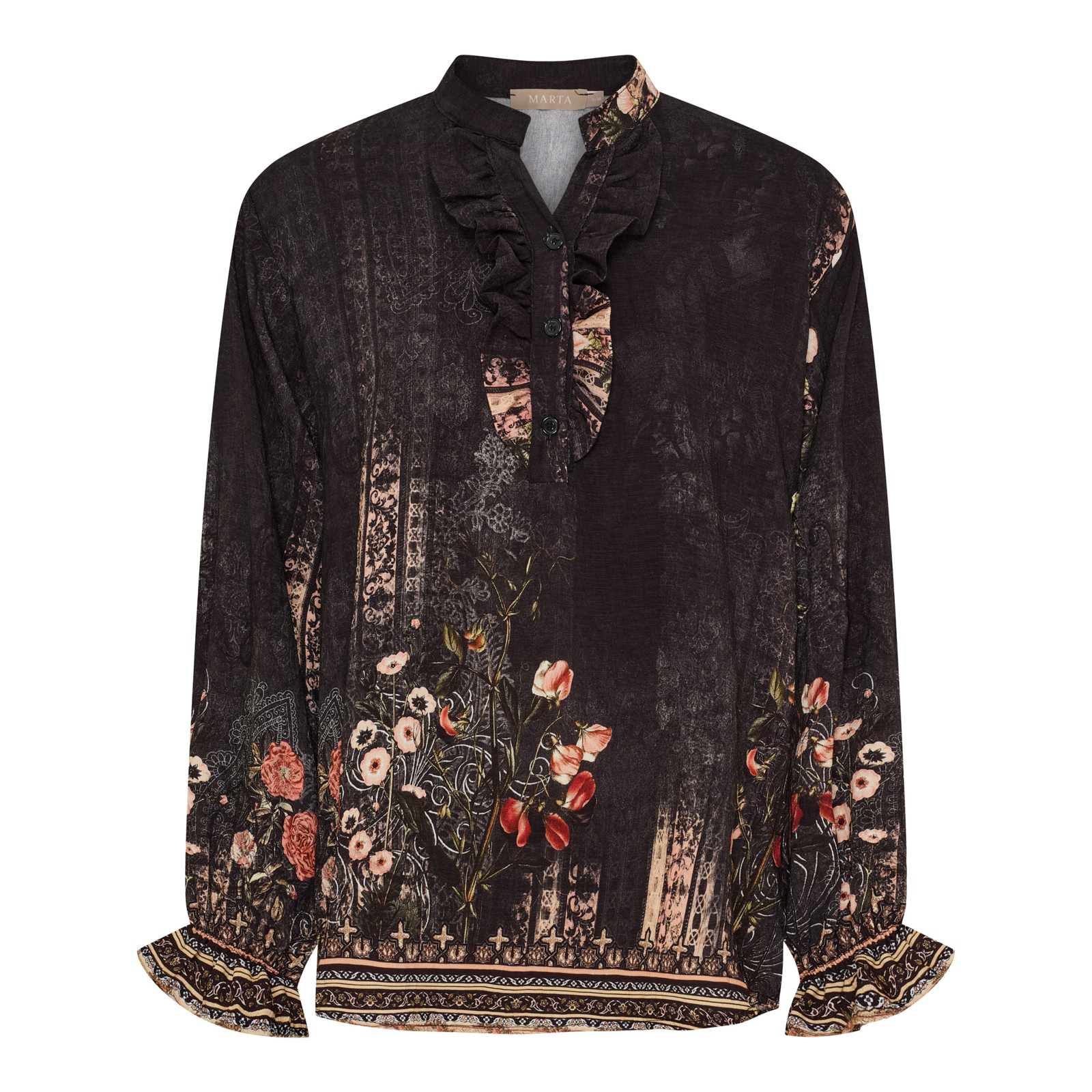 Smuk printet Marta skjorte. Skjorten har en lille v-udskæring, stolpelukning og flæse. Ærmerne er lange med en smal elastikkant . Kan styles til både hverdag og pænere brug.