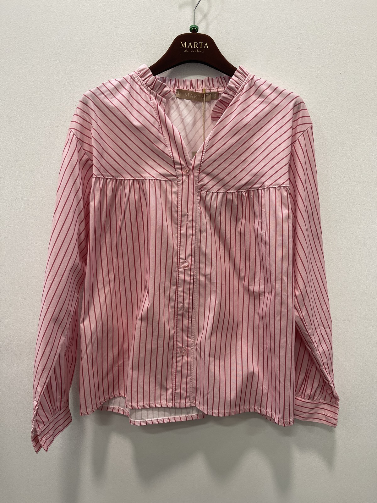Frisk Marta skjorte med flotte striber. Skjorten er gennemknappet og har en flot krave med flæsekant. Henover bærestykket er en syning som giver skjorten et feminint touch.