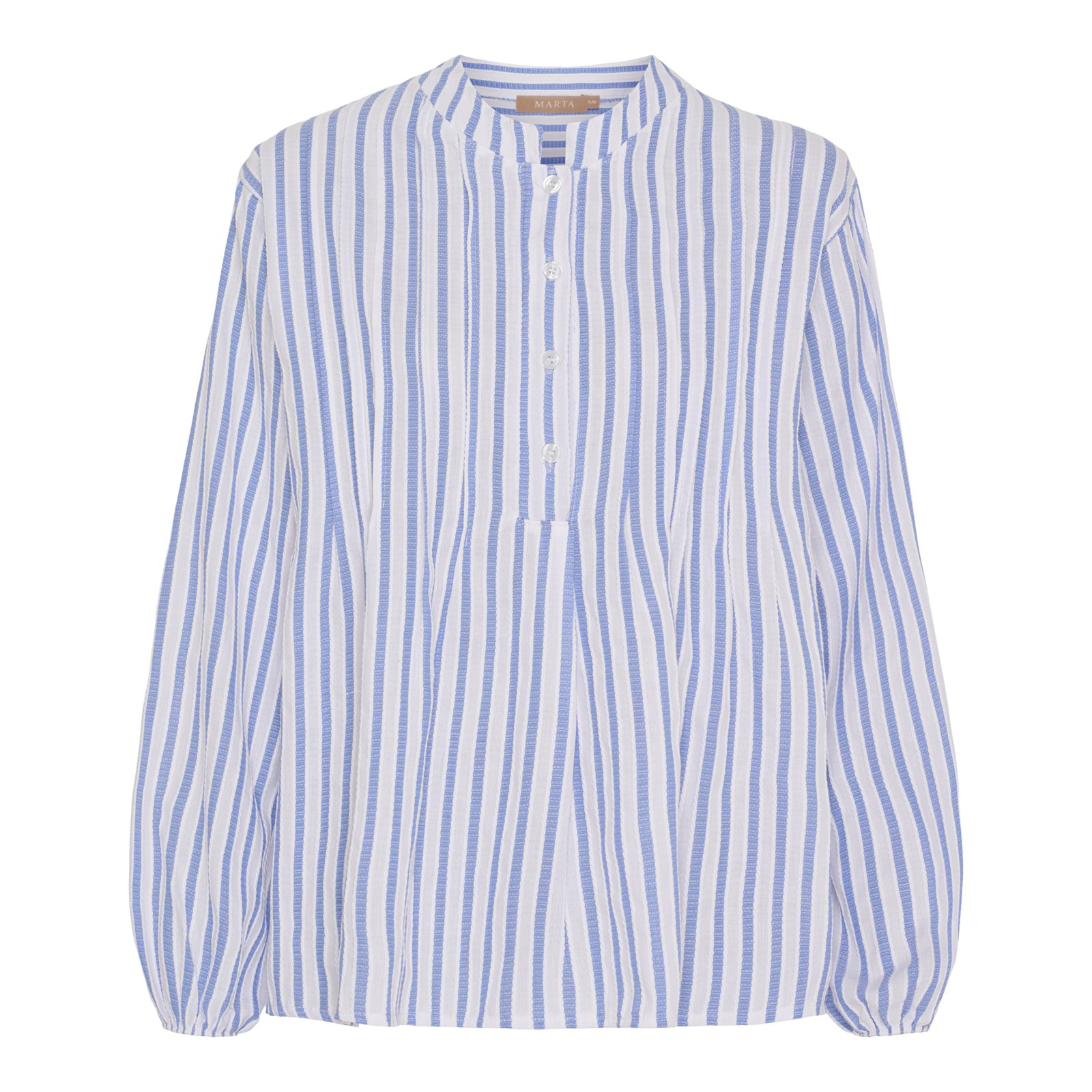 Super sød og klassisk stribet Marta skjorte. Den har kinakrave, stolpelukning og lange ærmer. Stoffet har en flot struktur. Skjorten er perfekt i hverdagsgarderoben og kan bruges både for et afslappet og stilrent look.