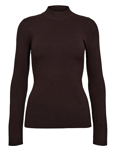 Lækker blød viskose pullover fra Nümph. Strikken har en tætsiddende pasform med en fin turtleneck og lange ærmer. Den har en super flot chokolade brun farve med en ribbet struktur.