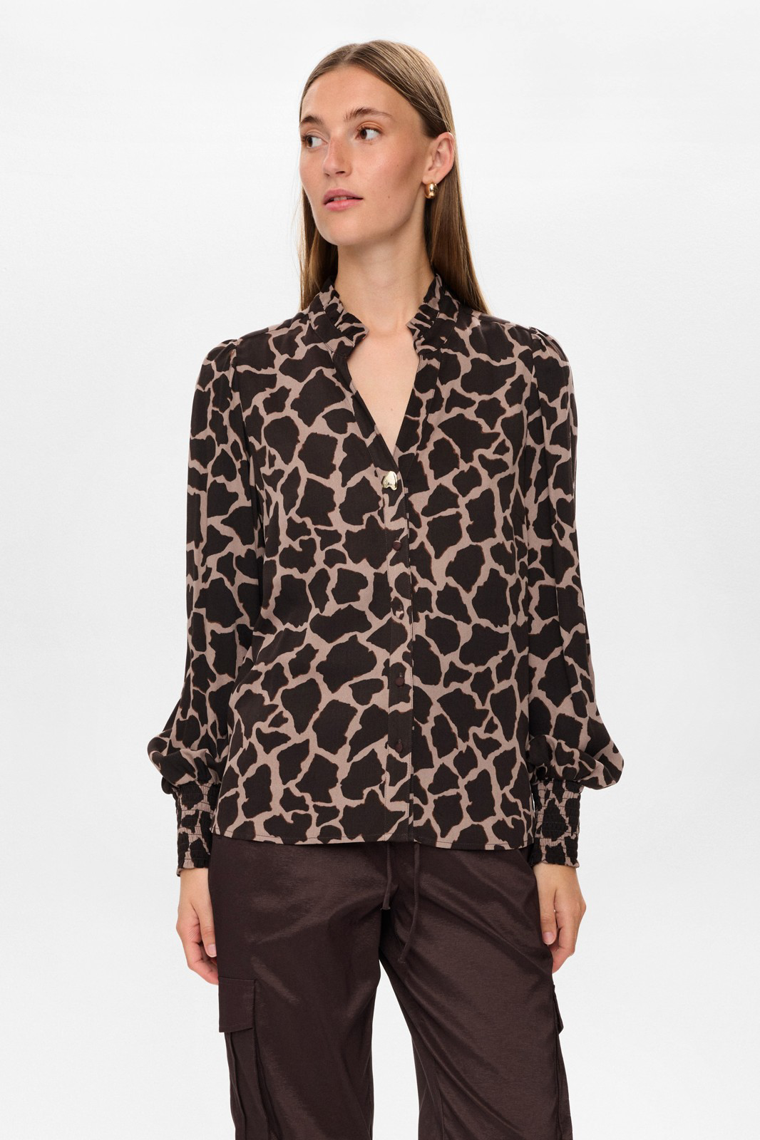 Culture står bag denne smukke viskose skjorte. Den har et shiny udtryk som står superr flot til det grålige og rosa print på fronten. Skjorten har 7/8 lange ærmer, diskret puf på skuldrene, knaplukning foran og krave.