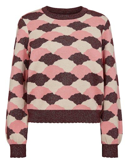 Farverig og festlig strik fra Nümph. Strikken har rund halsudskæring, lange ærmer med ribkanter. Den har et grafisk bølgemønster i rosa, bordeaux og beige farver. En diskret glimmertråd er vævet ind i mønsterer. Kan styles til et par rå jeans eller en kort nederdel og lange støvler.