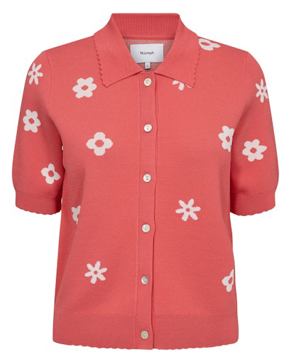 Skønneste pink cardigan fra Nümph med hvide indvævede figurer. Den har korte ærmer, er gennemknappet og har en fin krave. Femnine bølgekanter på krave ærmer og i bunden. En typisk Nümph style.