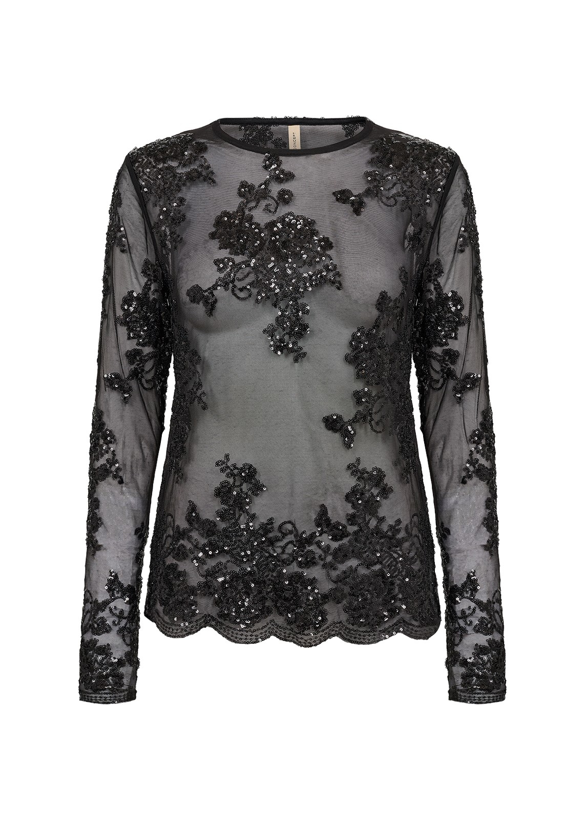 Smukkeste bluse fremstillet af 95% polyester og 5% elastan. Denne elegante t-shirt har lange ærmer, paillet- og blondedetaljer hele vejen igennem. Style den sammen med enkle bukser eller en nederdel for et iøjnefaldende outfit.
