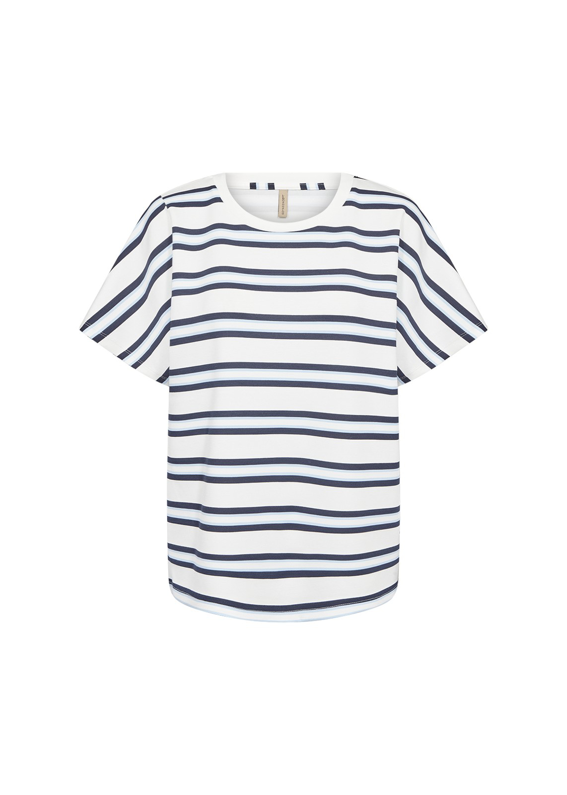 Barni T-shirt fra Soya Concept har et afslappet og behageligt look. Den har en klassisk rund hals, korte ærmer og et smart stribemønster. Style den med jeans eller shorts for et cool, afslappet look.
