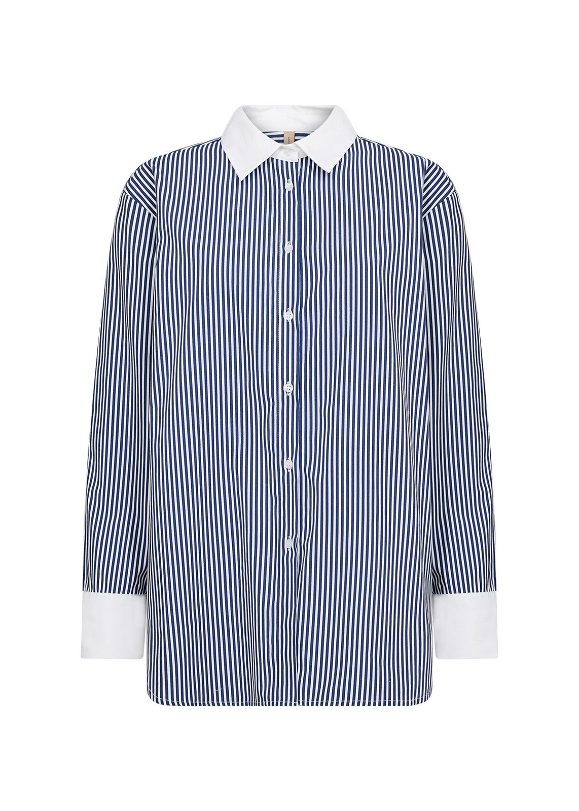 Super flot skjorte fra Culture med klassiske hvide striber og krave. Skjorten har lidt længde med slidser i siden og flot afrundet kant nederst. De påsatte bloster giver skjorten et feminnt touch.