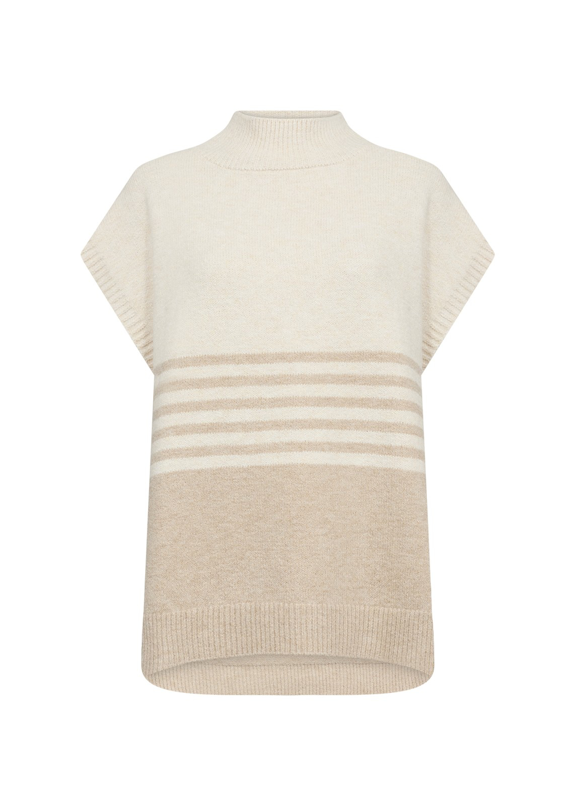 Stilfuld vestfra Soya Concept. Den har en har en ribbet krave, brede armåbninger og et stribet mønster henover midten af vesten. Vesten har en løs pasform og er perfekt til lag på lag over skjorter og andet.