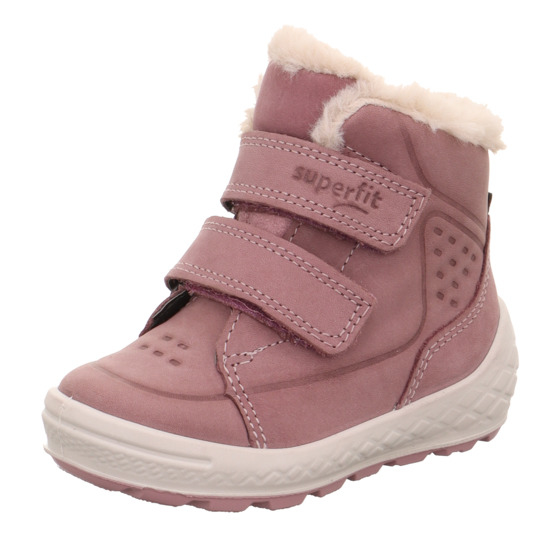 Fin, varme vinterstøvler i blush ruskind og tekstil. Lukkes med velcrobånd over vristen, der gør det nemt at tage støvlerne af og på. Støvlerne har en fast hælkappe, og de er let polstrede i åbningen.