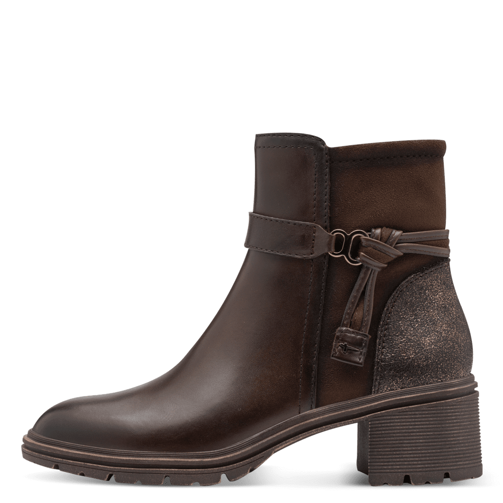 Super flot Tamaris ankelstøvle i brun med glimmer bagpå. Den måler 40 mm i hæl og 13 cm fra top ned mod hæl.